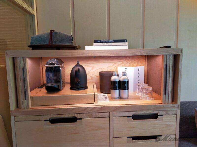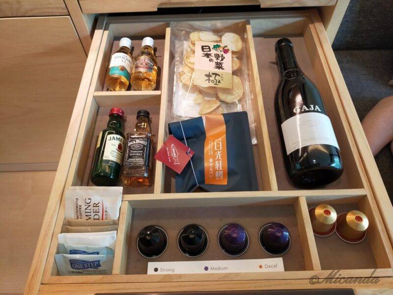 ネスプレッソのカプセルと別料金のお酒類とお菓子。