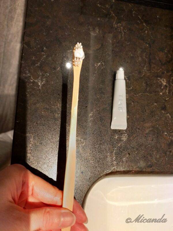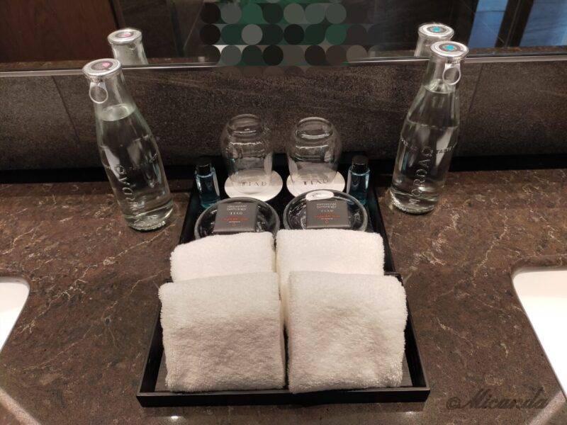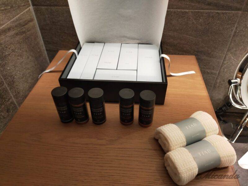 洗面台中央にハンドタオル、固形石けん、マウスウォッシュ等がセットされていました。