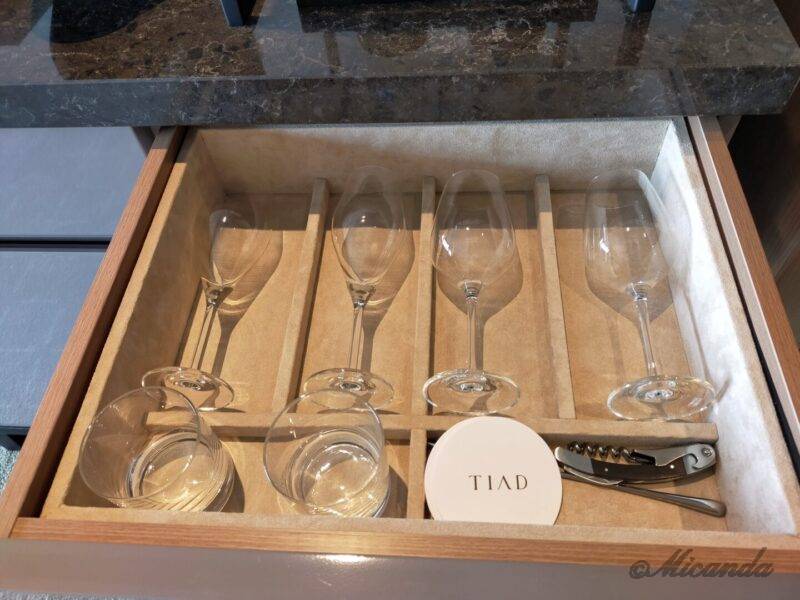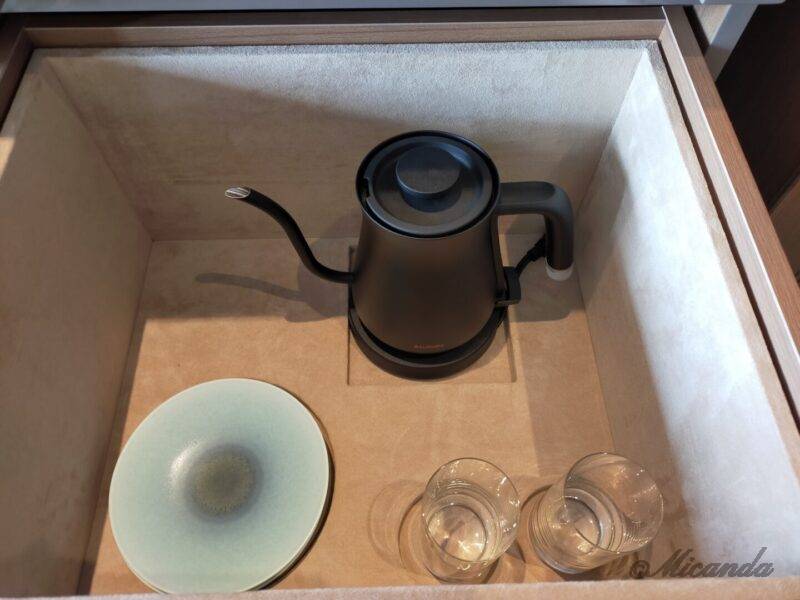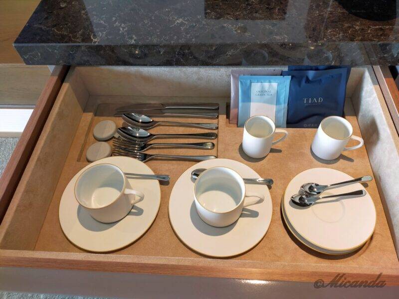 引き出しにはお茶、紅茶、コーヒーカップ、カトラリー等