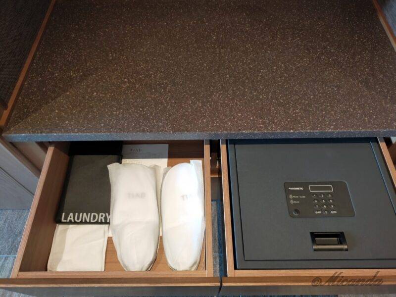 クローゼットの引き出しには金庫、ふかふかスリッパ、ランドリー関係グッズがありました。