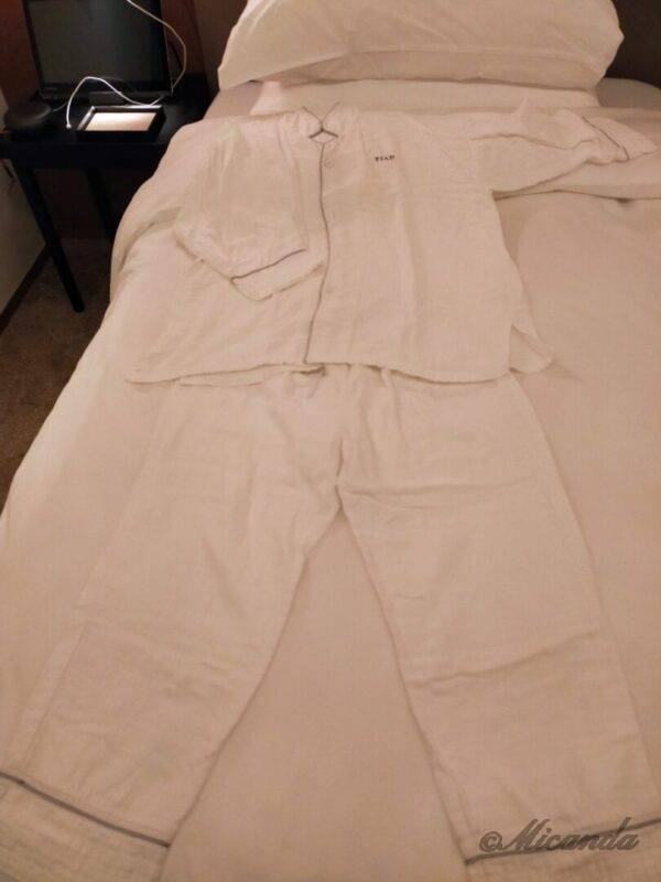 バスローブは白地にネイビーのラインの入ったスッキリとおしゃれなデザインでした。