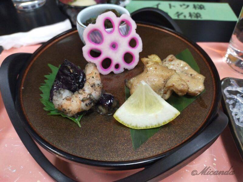 口取りはじゅんさいもずく・海老と茄子の黒胡麻和え・鶏ハラミの炭火焼