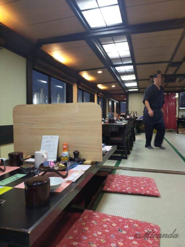 乗船後、靴を脱ぎ、決められた席に着席しました。