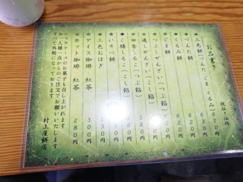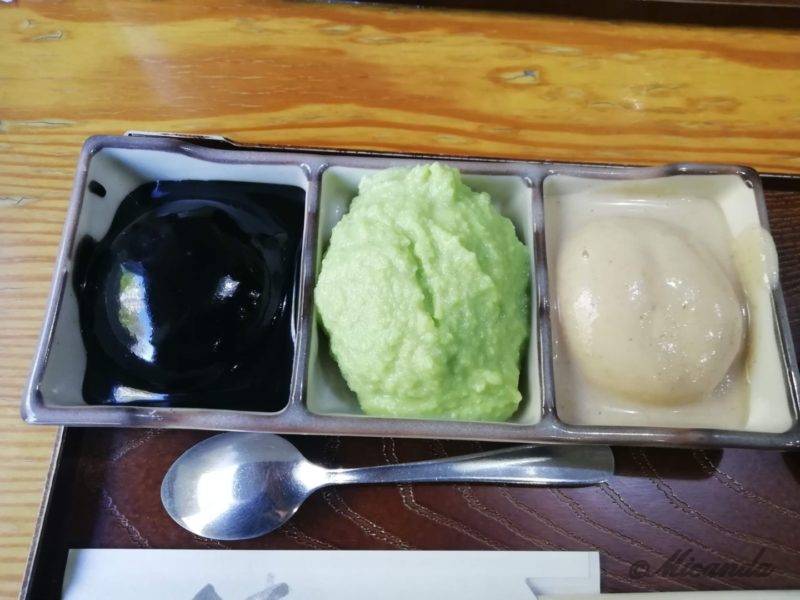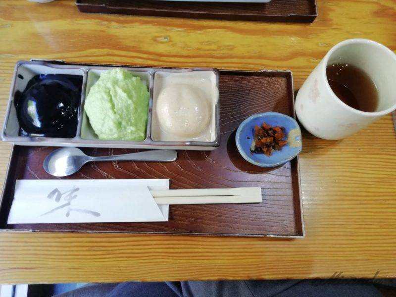 旅行中、他のお店でずんだ餅をいただいていたので、この日は三色餅(ずんだ・ごま・くるみ)にしてみました。