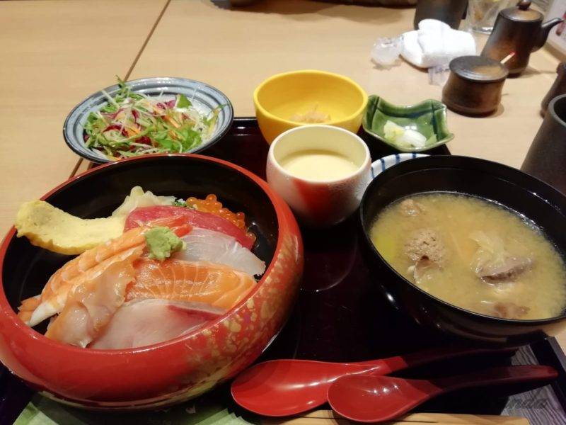 私たちは海鮮丼とあら汁、そして天ぷらがセットになったランチセットをいただきました。