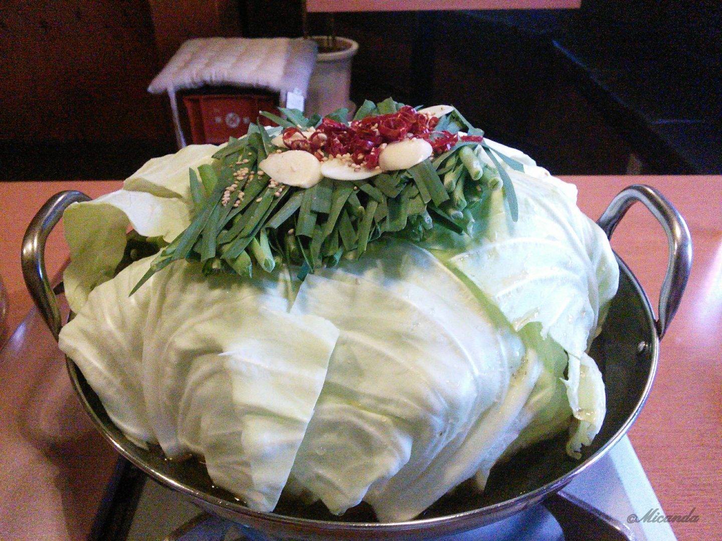 まずはお汁を鍋に入れ、その後でモツやキャベツなどを入れてグツグツと煮込みました。