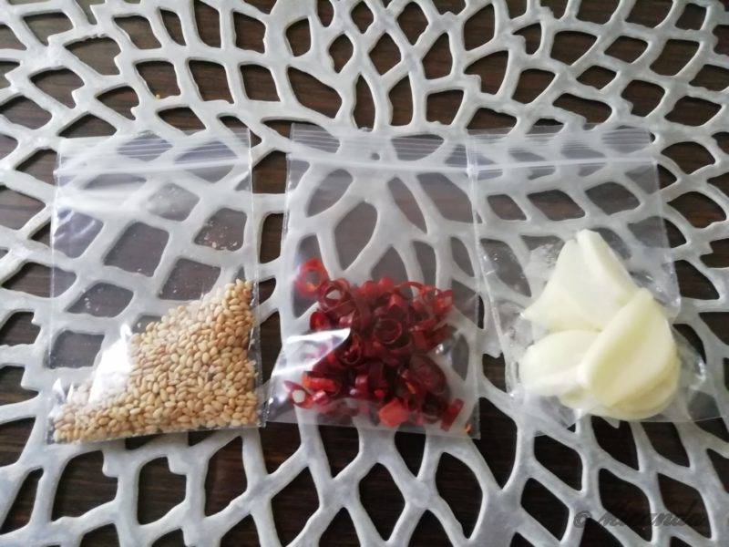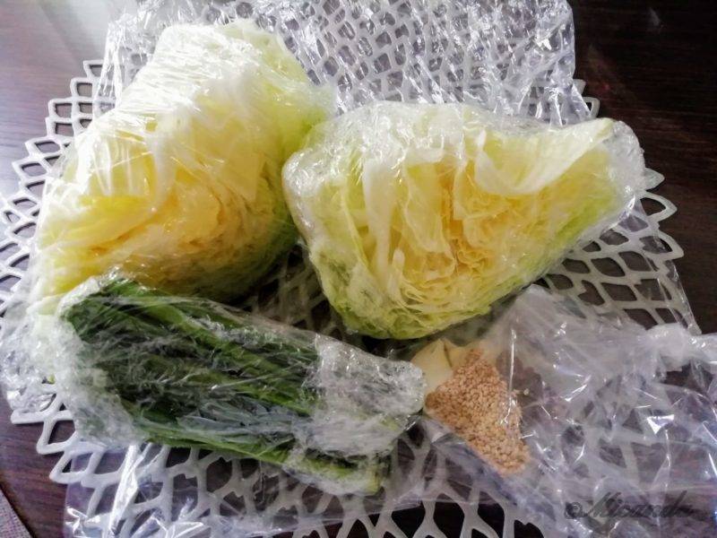キャベツ、ニラ、胡麻、ニンニク、鷹の爪です。