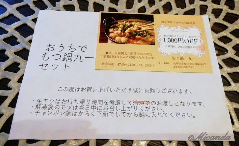 先日、もつ鍋の九一さん(小田急線向ヶ丘遊園駅北口)がもつ鍋具材のテイクアウトをされているという情報を得たので、さっそく予約してみました。