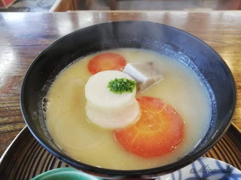 白味噌仕立ての御汁に、お野菜とあんの入ったお餅が入っているお雑煮です。