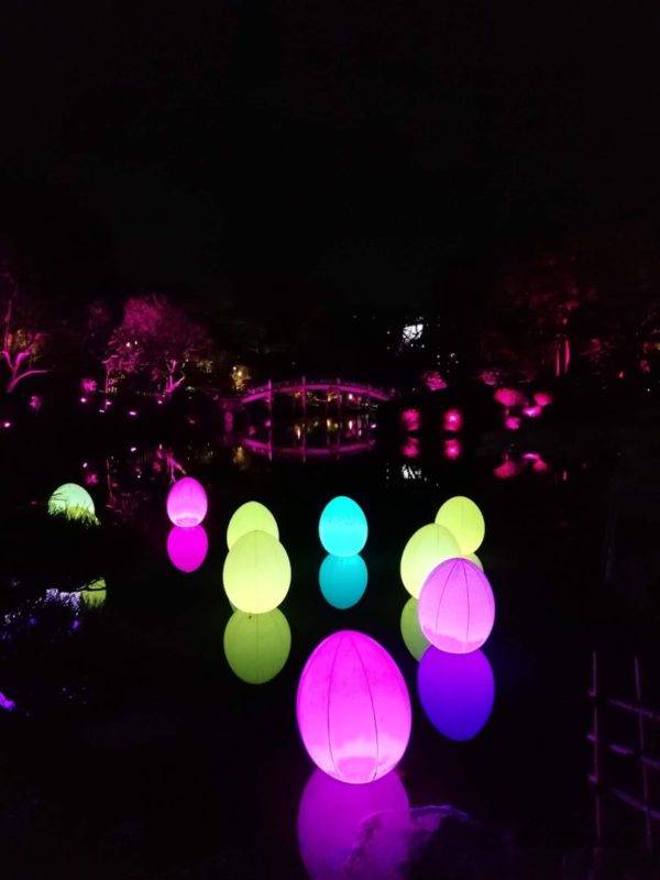 私が高松市を訪れた時は栗林公園で「チームラボ 栗林公園 光の祭」という光のアートが開催されていたので、夜に再び、栗林公園に戻りました。