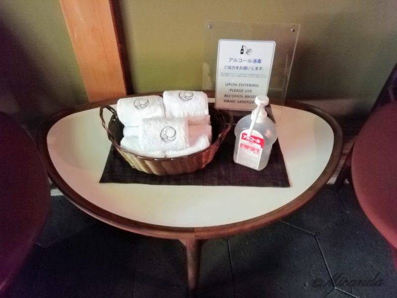 今となってはやらないと落ち着かなくなったアルコール消毒がタオルと共に用意されていました。