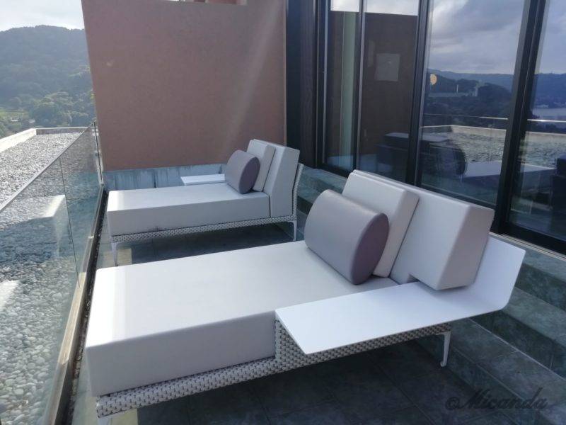 バスルームから続くテラスにはサンラウンジャーがあり、のんびりと海を眺められます。