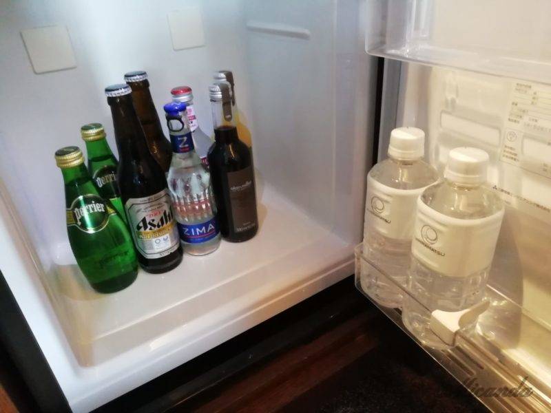 冷蔵庫の中のアルコールは有料ですが、お水やペリエ、アラン・ミリアのジュースは無料です。