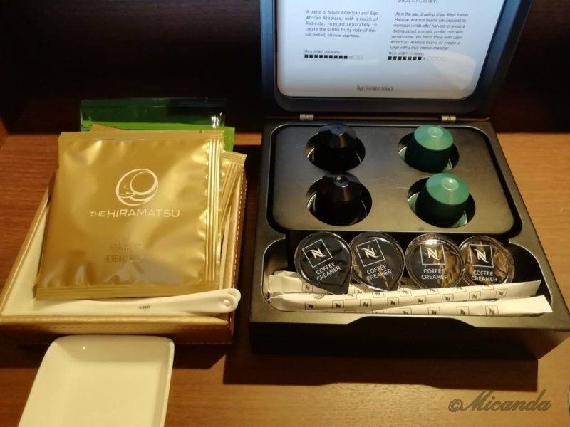 ハーブティー・ダージリンティー・緑茶のティーバッグとネスプレッソが用意されていました。