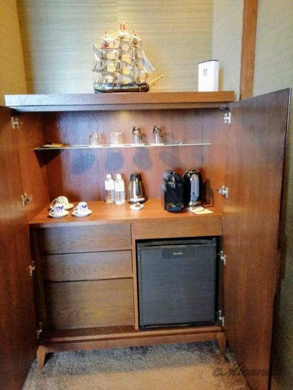 木製の棚の中はミニバーです。