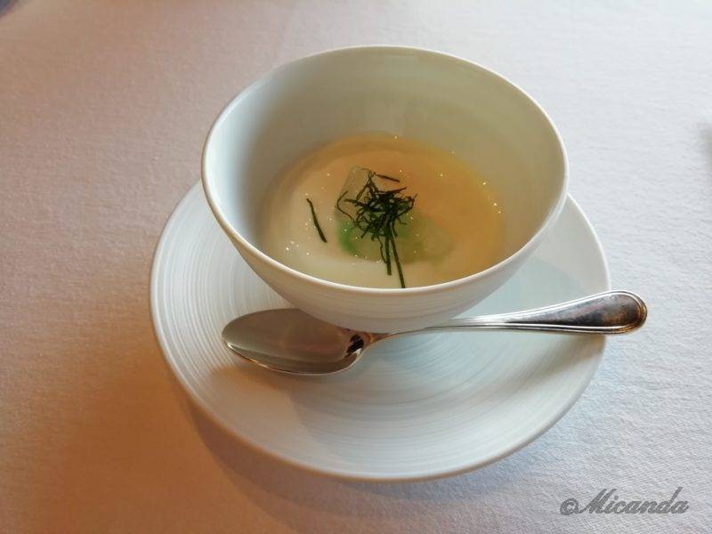 こちらは、松本農園とうもろこしのムースコンソメのジュレトリュフ風味 天城軍鶏(アマギシャモ)のブロシェットです。