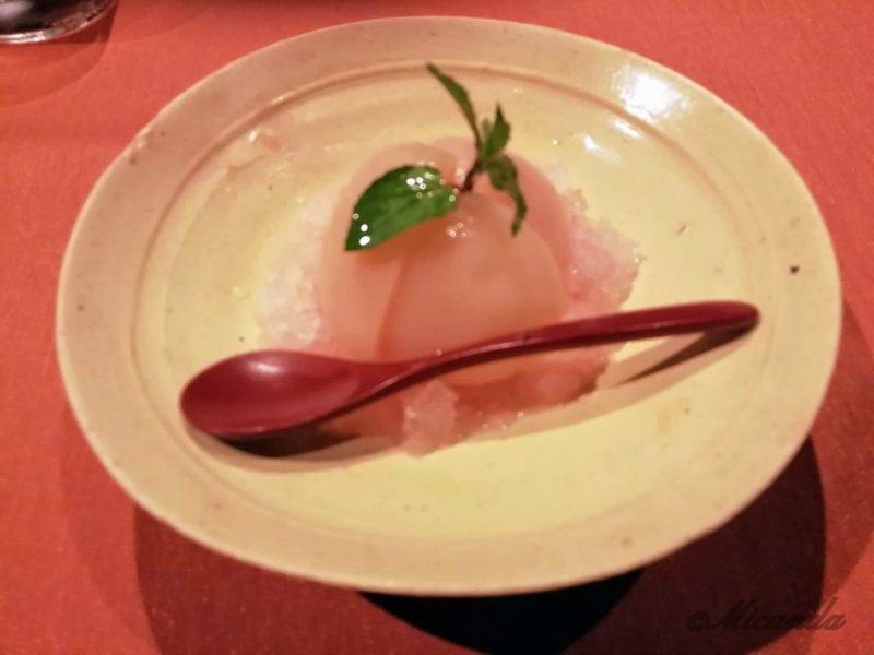 白桃のコンポートマラスキーノ風味のグラニテと共に です。