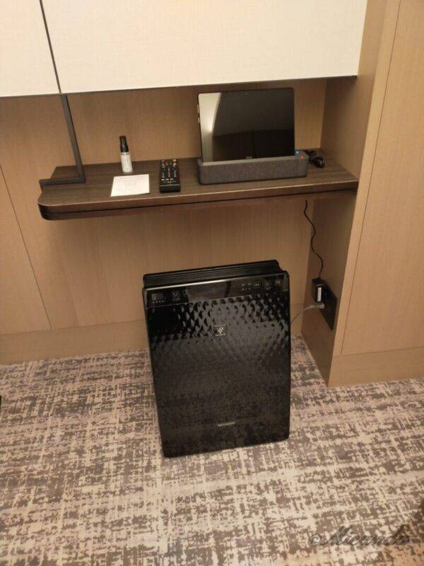 空気清浄機、手指消毒スプレー、ホテル案内用タブレットです。