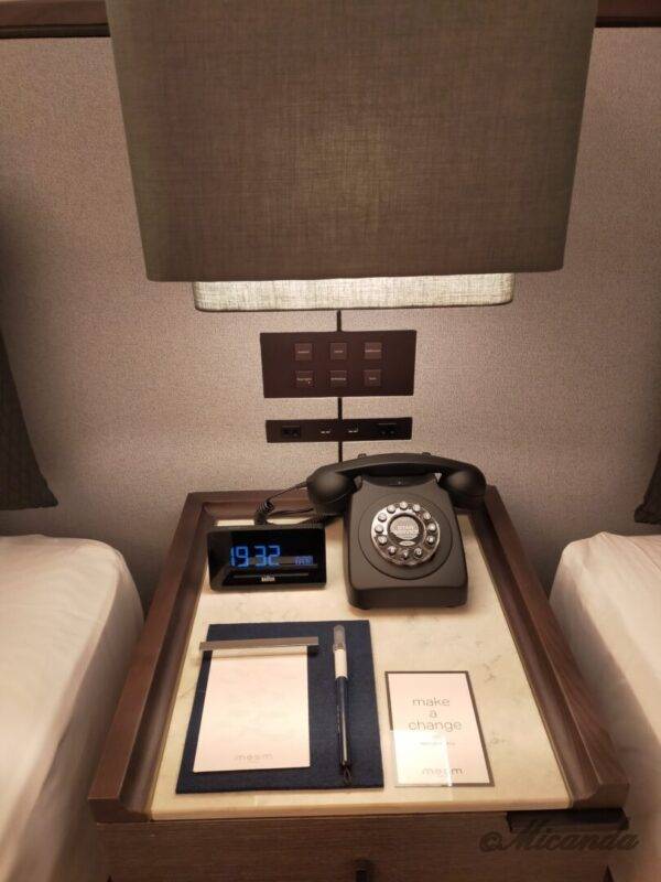 ベッドサイトには電話、目覚まし時計、メモ帳と筆ペンがありました。