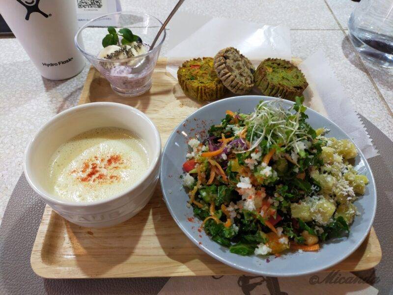 3種の野菜のマフィン(マッシュルーム、ほうれん草、カレー味)、ケールとキヌアのデリ、コーンスープ、ミニスイーツ(ブルーベリーヨーグルトとチアシード)でした。