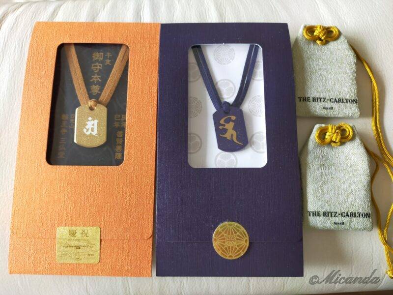 (右側のお守りはリッツ・カールトンでいただいた宿泊記念のお守りです。)